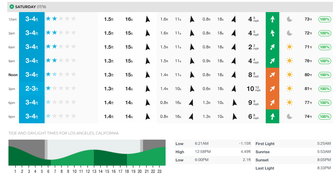 Conditions look good: waves 3-4 feet, SUNNY, low wind. Water has been low 60s, but feels colder when it’s overcast.