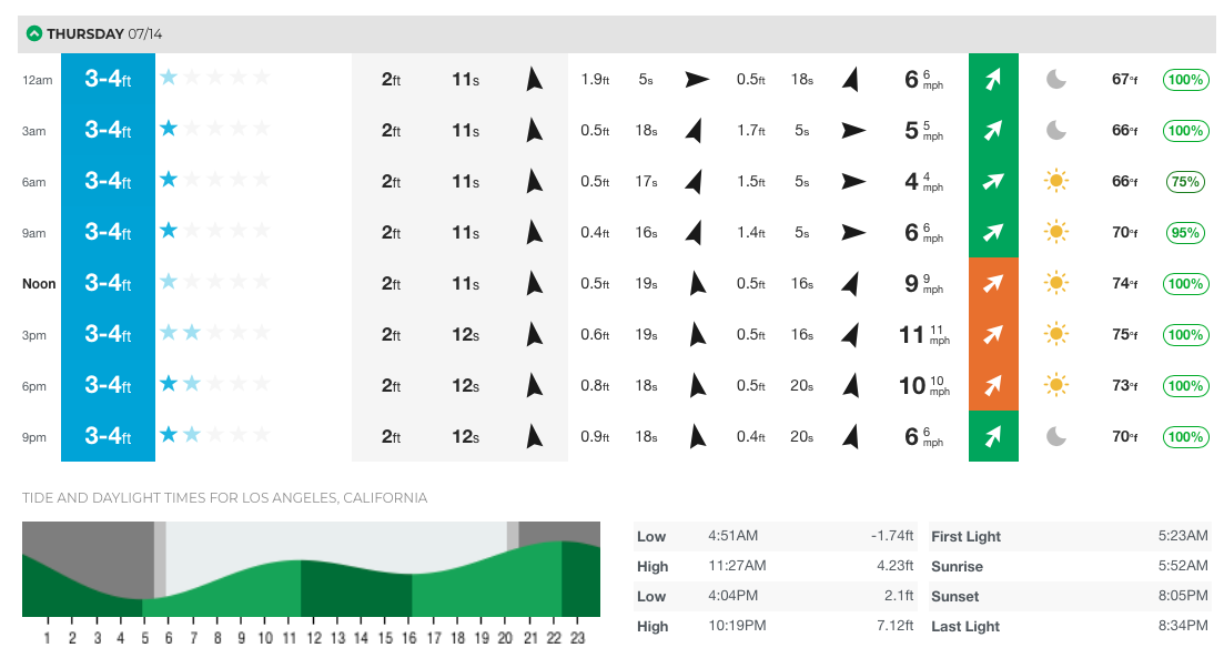 Conditions look good: waves 3-4 feet, SUNNY, low wind. Water has been low 60s, but feels colder when it’s overcast.